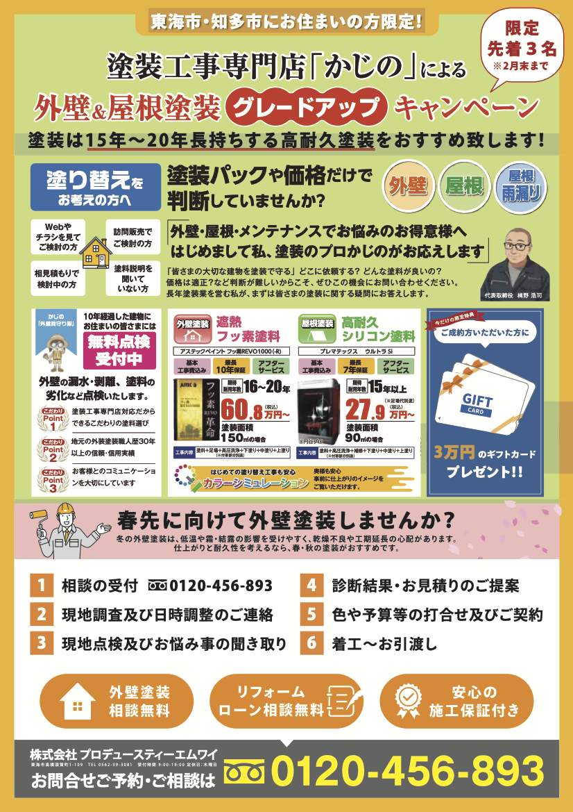 塗装工事専門店「かじの」による外壁・屋根塗装のグレードアップキャンペーンを実施しています。