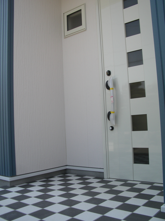 白黒タイルでの、こだわりの玄関ポーチ白を基調とした玄関ドアと、モノトーンの市松模様タイルが調和したスタイリッシュな玄関です。