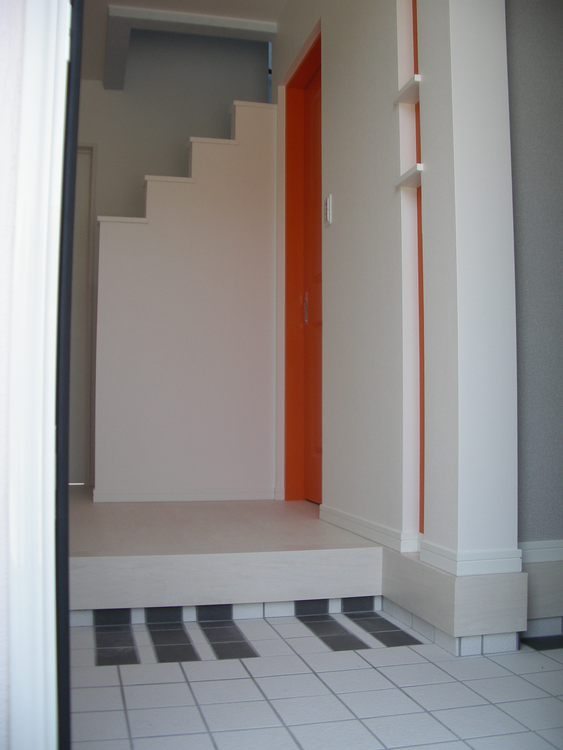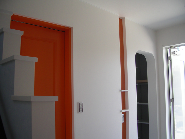 ビビッドカラーの玄関ホールホワイトを基調とした空間に、オレンジの建具やラインをアクセントに取り入れたデザインです。