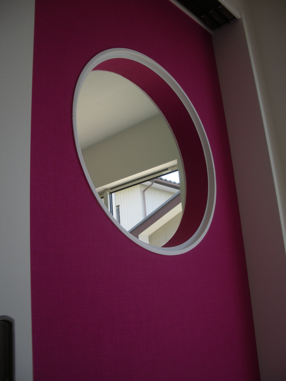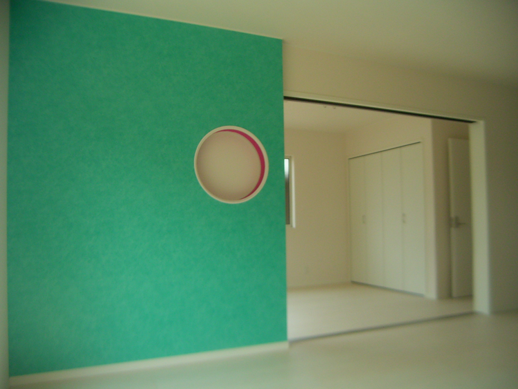 遊び心のある丸窓デザイン鮮やかなピンクの建具に施された丸窓は、インテリアのアクセントとしてだけでなく、子どもたちの好奇心もくすぐる楽しいデザインです。