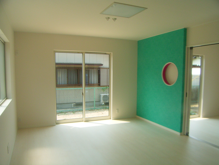 アクセントウォールに取り入れたティファニーカラーのグリーンと丸窓が、デザイン性と遊び心をプラス。