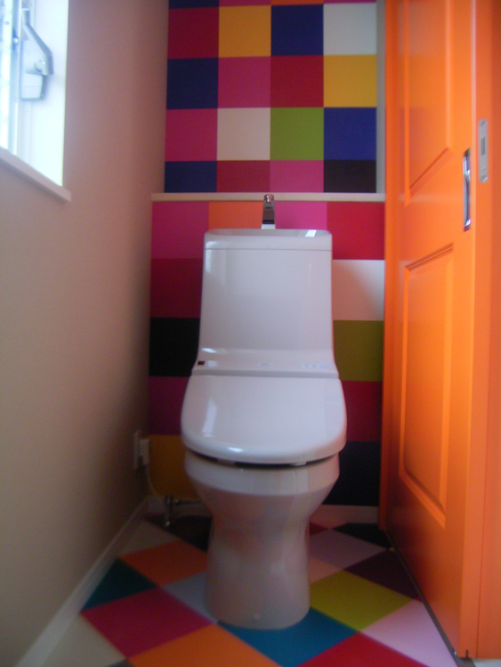 トイレ空間壁と床に取り入れたカラフルなタイル柄が印象的なトイレです。