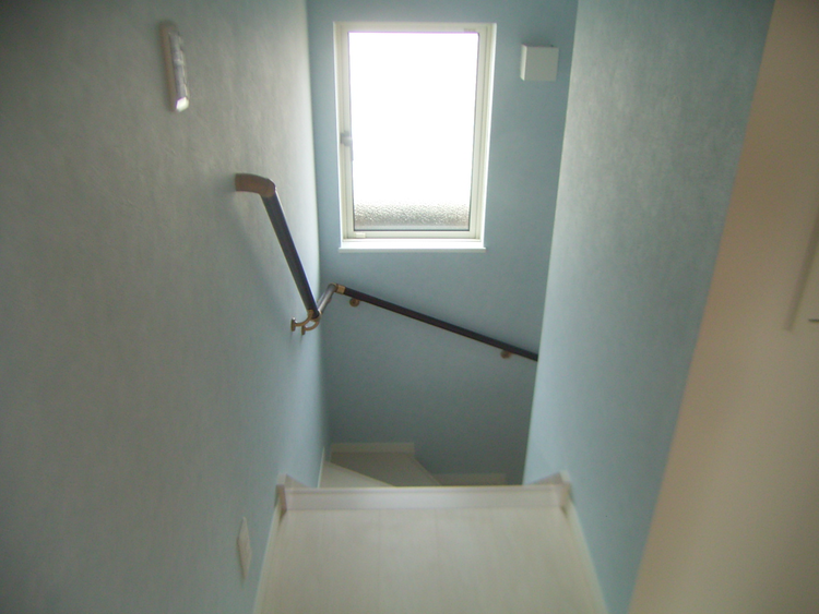 階段スペースやさしいブルーのクロスが爽やかな印象を与える階段スペースです。