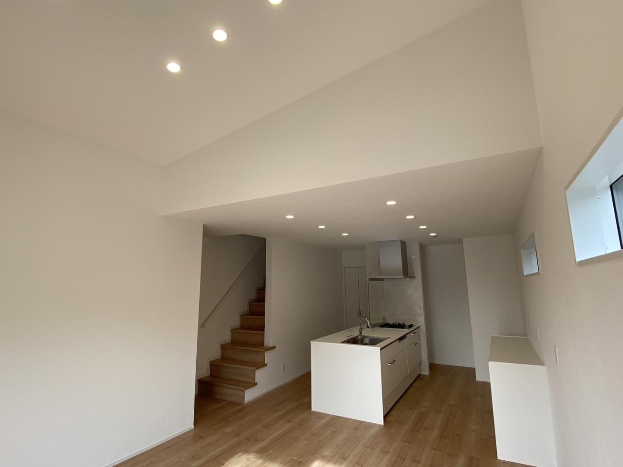勾配天井LDK一体型の空間に屋根勾配を活かした天井デザイン。視覚的な広がりを感じるリビングは、家族の団らんの場として心地よい空間になっています。自然光が差し込む明るい空間で、くつろぎのひとときを過ごせます。